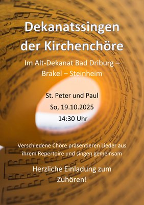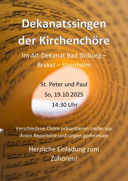 Seit über 30 Jahren treffen sich die Kirchenchöre des Alt-Dekanats Bad Driburg - Brakel - Steinheim an den verschiedenen Standorten im Raum des Alt-Dekanats, in diesem Jahr in St. Peter und Paul Bad Driburg. Die Chöre präsentieren Werke aus ihrem Repertoire und singen auch gemeinsame Stücke. Herzliche Einladung an alle Interessierten zum Zuhören!