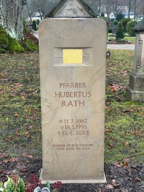 Als die Stadt Bad Driburg um Hilfe bei der Gestaltung des Grabsteins bat, war sofort klar, dass dieses Symbol seines Glaubens und seiner Hoffnung auf dem Grabstein einen Platz haben müsste. Entweder im Zusammenhang mit einer Tür oder einem Fenster. Nach längerer Debatte im Pastoralteam und mit Gemeindemitgliedern war klar, es sollte ein Fenster sein, als Zeichen für die Fenster, die Pfarrer Rath in seiner Zeit in Bad Driburg geöffnet hatte. Im Einverständnis mit seiner Familie und Frau Markowski wurde dieser Entwurf an die Stadt übergeben, die dankenswerter Weise die Arbeiten beauftragt hat, die nun zu einem schönen Ende geführt worden sind.
