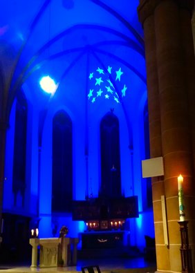 Die Pfarrkirche St. Peter und Paul war in sanftes blaues Licht gehüllt und weiße Sterne an der Decke schufen eine besondere Atmosphäre für das Konzert des Vokalensembles Bad Driburg am letzten Sonntag. Das Ensemble präsentierte ein eindrucksvolles Programm unter der Leitung von Simon Brüggeshemke, der den Titel Leuchtturmkirchenmusiker trägt und für seine innovativen künstlerischen Projekte bekannt ist. Ein besonderes Highlight war die Erstaufführung des Stücks „Stars“ des lettischen Komponisten Ēriks Ešenvalds in Bad Driburg. Das Werk ist bereits von vielen Chören aufgeführt worden, für das Vokalensemble war es jedoch Premiere. Mit diesem Stück wollte das Ensemble die über 900-jährige Glastradition der Stadt aufgreifen. Dafür wurden Gläser, die mit Wasser gefüllt waren, durch Streichen des Randes mit dem Finger zum Klingen gebracht. Jedes Glas wurde individuell markiert und gestimmt. Beim Einstudieren wurde viel experimentiert, um die Töne exakt zu treffen. Die Gläser der Marke LEONARDO stellten Bianca und Oliver Kleine, Geschäftsführer der Firma glaskoch Bad Driburg, freundlicherweise zur Verfügung.