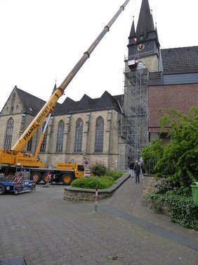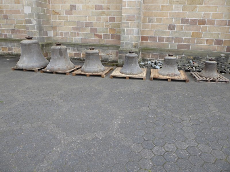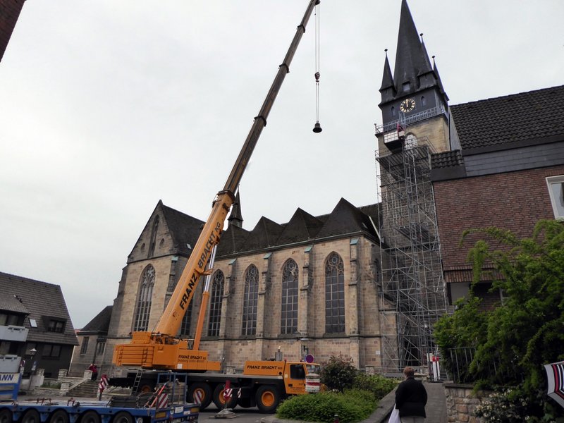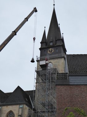 Die alten Stahlglocken, 1946 angeschafft, wurden aus dem Turm geholt. Um 9:00 Uhr war der Kran auf dem Steinplatz aufgestellt und bereit. Dann schwebten die Glocken eine nach der anderen aus der Glockenstube durch das nördliche Turmfenster auf die Erde herab.