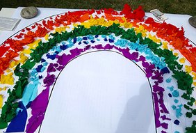 Musikalisch unterstützt wurden sie von der Stadtkapelle Bad Driburg unter der Leitung von Ulrich Winsel. Die Musikerinnen und Musiker sorgten für einen festlichen Rahmen und begleiteten die Lieder der Gemeinde klangvoll. Ein weiterer Höhepunkt war der Auftritt des kirchlichen Kinderchores aus Altenbeken, der unter der Leitung von Britta Claes das Lied „Noah baut ein großes Boot“ vortrug. Passend zum Lied „Wenn der Himmel nicht mehr weint“ gestalteten die Kinder ein großes Regenbogen-Plakat aus Papierkügelchen – ein buntes Zeichen der Hoffnung. Die Fürbitten wurden von Anni Köhler und Andreas Brennecke gesprochen. Die Kollekte kam der Bildungsarbeit in Entwicklungsländern zugute.