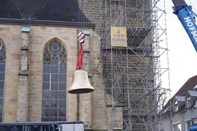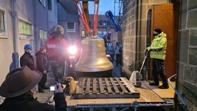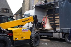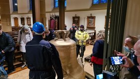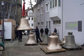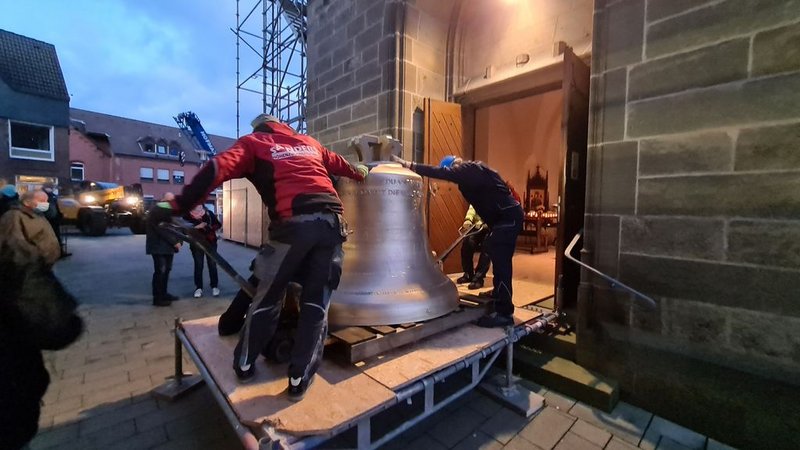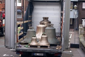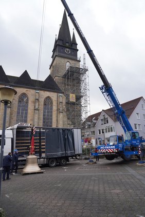 Die Glocken wurden am Freitag angeliefert und von einem Kran an die Kirche gehoben. Dort wurden sie vom Glockensachverständigen des Erzbistums, Dr. Gerhard Best geprüft und abgenommen. Danach wurden sie in die Kirche transportiert.